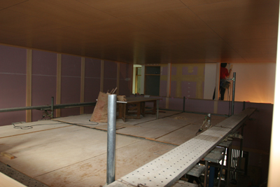HOME > 教会移転 > 教会移転 建築状況 2006/10/14 10月14日、建築状況の確認のため、現地を訪れた。お広前の天井は張り終わり、内装のクロス貼りが行われていた(写真)。 外装は、ここ数日お天気に恵まれたこともあって、順調に進んでいた。来週早々には足場も外され、やっと外観を眺めることができる予定となっている。