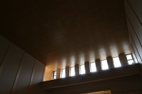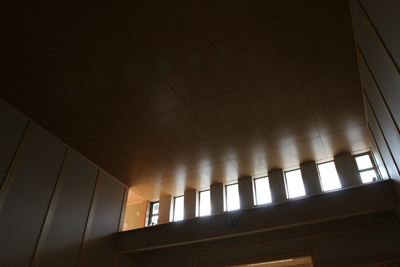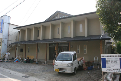 HOME > 教会移転 > 教会移転 建築状況 2006/10/17 10月17日、ようやく外壁の足場が外され、建物の全景が見られるようになった。内装のクロス貼りも順調に終わり、現在は、照明設備と神殿、霊殿の檜板の取り付けが行われている。 神殿上部には、明かり取りの窓が8つ付けられている。これは、八つ波にちなんで、八つの光の波が差し込むようにイメージされている。