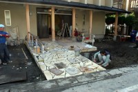 HOME > 教会移転 > 教会移転 建築状況 2006/10/26 10月26日(木)、庭等に植えてもらう鉢植えの運搬を行った。現場では、11月1日の引き渡しに向けて、作業が急ピッチに進められていた。 写真は、玄関のアプローチ部分。正面には、シンボルツリーとなる木が植えられ、両サイドは駐車スペースとなる。30日には、ご神具の搬入が行われる。