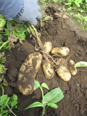 HOME > 雑記 > みのり > みのり 雑記 じゃがいもの収穫に参加 2012/06/29 6月28日(木)、みのり実行委員会主催のじゃがいもの収穫が行われ、副教会長が参加。アンデス、キタアカリ、メークインの3種のじゃがいもを収穫した。 先日の台風によって、畑に設置してある小屋がひっくり返ってしまいました。