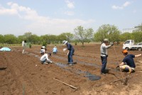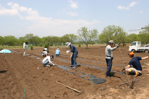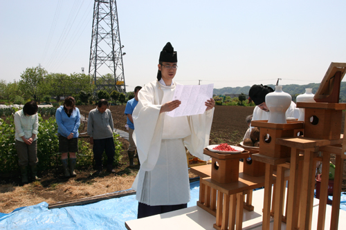 HOME > 雑記 > みのり > みのり 雑記 鍬入れ祭 2007/05/04 5月4日(祝)、首都圏の青年信奉者等で構成される「みのり実行委員会」主催の鍬入れ祭とさつまいもの植え付けが行われ、副教会長が参加した。 当日は、今年一年の実りと作業の安全を祈願し、鍬入れ祭をお仕えし、お供えしていたトウモロコシの種を植え付けた。その後、メークイン等のじゃが芋の芽かきを行った。