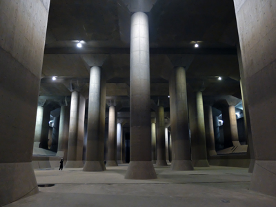 近年、洪水による被害も多いことから、このたびの参加となった。写真の調圧水槽は、地下トンネルから流れてきた水の勢いを弱め、スムーズに流すための巨大プールで、その荘厳な雰囲気から、地下神殿とも呼ばれている。