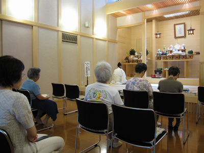 HOME > おひろまえ > おひろまえ 上半期御礼御祈念信行・生神金光大神様月例祭 2009/07/05 7月5日(日)、正午から教会長ご祭主のもと、生神金光大神様月例祭にあわせて上半期御礼御祈念信行が仕えられ、ご神前でそれぞれが玉串を捧げ、御礼を申し上げた。 祭典後、写教(教典、教典抄から、取り組むべきみ教えを選び、書き写す)し、ご神前にお供えした。 そして直会が賑やかに執り行われた。