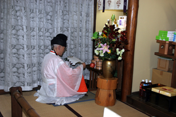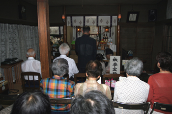 HOME > おひろまえ > おひろまえ 秋のみたま祭 2005/09/23 9月23日午後1時半、教会長ご祭主のもと、秋のみたま祭が仕えられた。 祭典後は、いつものように神饌物を参拝者全員で仕分けし、各家庭用のお下がりとして分配された。また、直会時には、教会移転について現況報告がなされた。