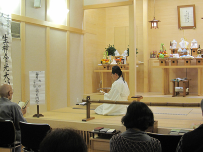 HOME > おひろまえ > おひろまえ 天地金乃神様月例祭・月例霊祭 2010/10/22 10月22日(金)午後2時から、天地金乃神様月例祭・月例霊祭が副教会長祭主のもと、ご奉仕され、この月に祥月命日をお迎えする15柱のご霊神さまに玉串をお供えし、御礼を申し上げた。 祭典後、教典抄『天地は語る』からみ教えを2節拝読させて頂いた。