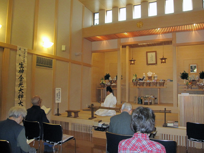 HOME > おひろまえ > おひろまえ 天地金乃神様月例祭・月例霊祭 2011/11/09 11月9日(水)、午後2時から天地金乃神様月例祭・月例霊祭が副教会長のご祭主のもとに仕えられた。 祭典後、教典抄『天地は語る』からみ教えを拝読した。