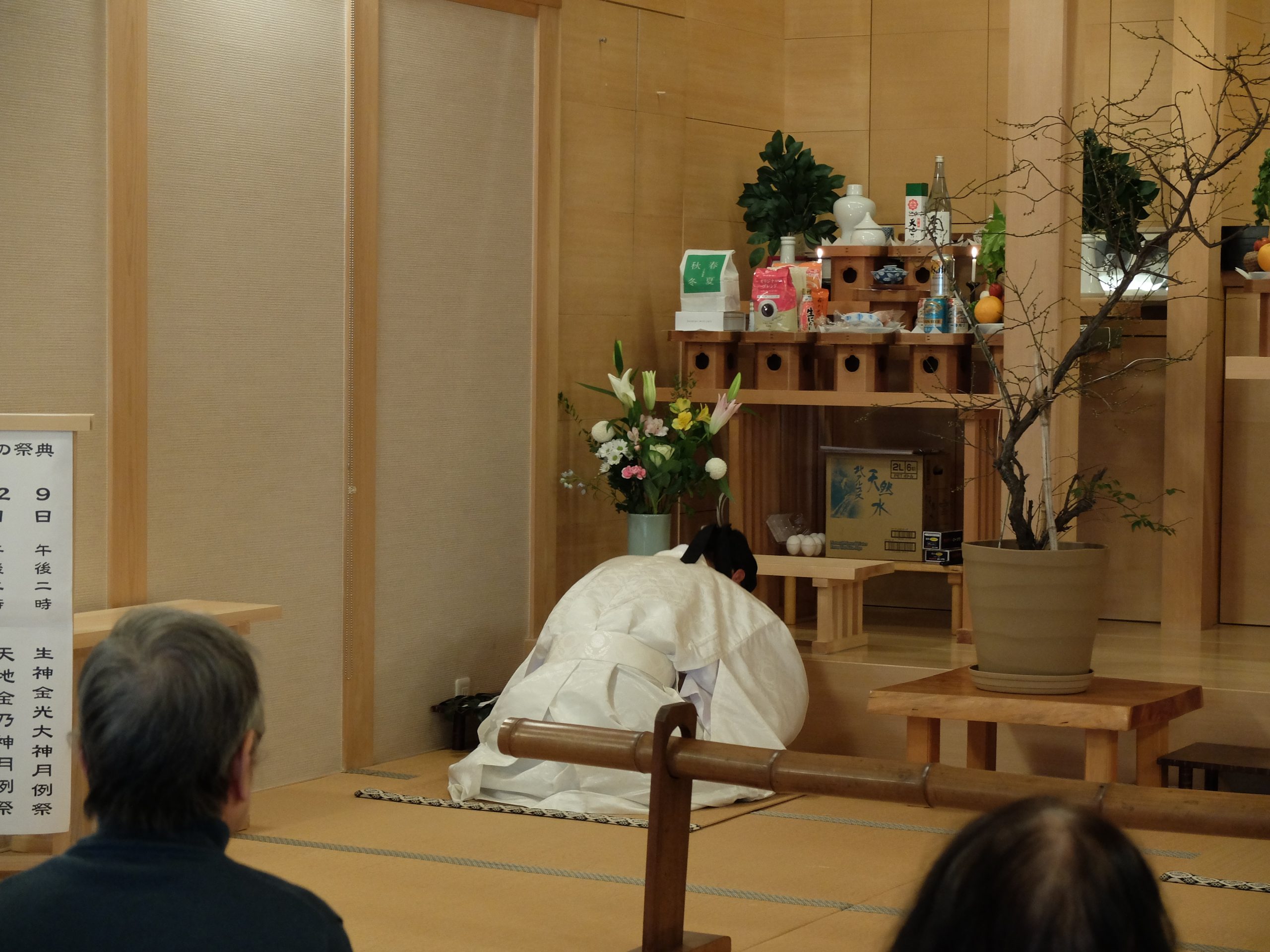 12月22日(日)、教会長祭主のもと午後2時から今年最後の天地金乃神月例祭・月例霊祭が仕えられ、この月祥月命日を迎える27柱のご霊神様に玉串を捧げた。