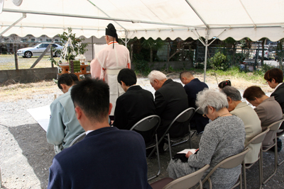 HOME > 教会移転 > 教会移転 地鎮祭仕えられる 2006/04/01 4月1日(土)正午、穏やかな春の陽気の中、新たな教会移転地(埼玉県春日部市)において、教会長祭主のもと、設計士、工事関係者、教会信奉者等と共に、地鎮祭が仕えられた。 これからお世話になるお土地への御礼とお願い、工事の無事安全を共々に祈願し、祭典後には、直会宴が持たれた。