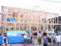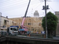 HOME > 教会移転 > 教会移転 棟上げ 2006/06/02 6月2日(金)、新教会の棟上げ式が行われた。当日朝から作業が行われ、夕方4時頃に無事に棟上げが完了。図面では分かりにくかった建物の規模など、目に見える形で確認ができるようになった。
